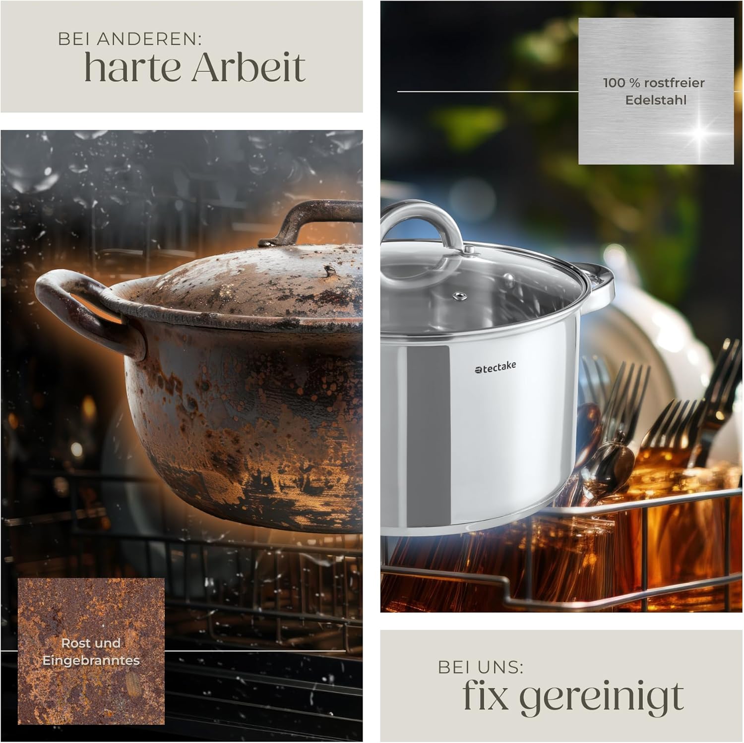 tectake® 15-tlg. Topfset. Edelstahl Kochgeschirr. Bratpfanne und Töpfe Set mit Deckel. Kochtopf Set für Induktionskochfeld. Gas- und Elektroherd geeignet. Topfsets für Camping und Wohnung. Küchensets